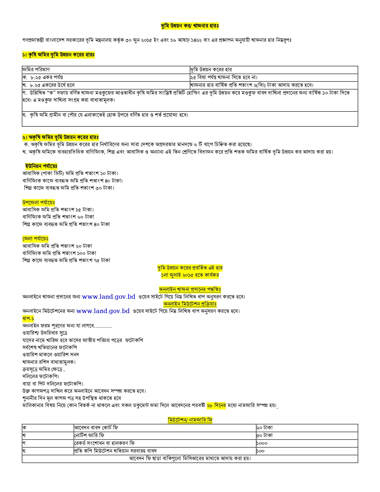 | ঘ. কৃষি জমি গ্রামীন বা পৌর যে এলাকাতেই হোক উপরে বর্ণিত হার ও শর্ত প্রযোজ্য হবে। | |